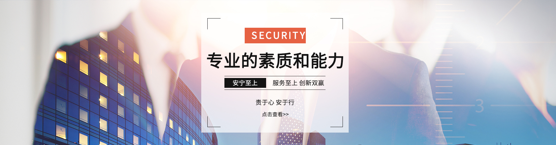 公司始終堅(jiān)持“務(wù)實(shí)、求精、效益、創(chuàng)新”的質(zhì)量方針,奉行“維護(hù) 雇主事業(yè)管理秩序,捍衛(wèi)雇主事業(yè)運(yùn)營安全,致力于雇主事業(yè)長期發(fā)展的保駕護(hù)航”服務(wù)宗旨,不斷加強(qiáng)公司管理層和員工隊(duì)伍建設(shè),以專業(yè)化、標(biāo)準(zhǔn)化的優(yōu)質(zhì)高效的服務(wù)質(zhì)量為各企事業(yè)單位提供專業(yè)的安全保衛(wèi)及物業(yè)管理服務(wù)。